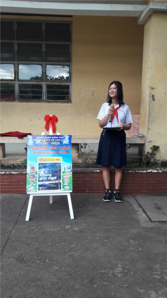 Hình ảnh các em đại diện đội công tác viên Thư viện trường tuyên truyền giới thiệu sách
