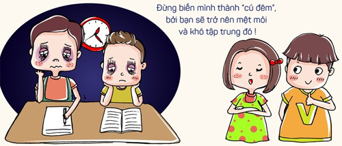 - Việc học tập căng thẳng cũng tạo nên cảm giác mệt mỏi. Vì thế, thời gian ngủ của các bạn phải được đảm bảo, hoạt động vui chơi giải trí cũng không thể bỏ qua. Quãng thời gian thư giãn có thể là lúc để các bạn hồi tưởng lại những gì đã học.